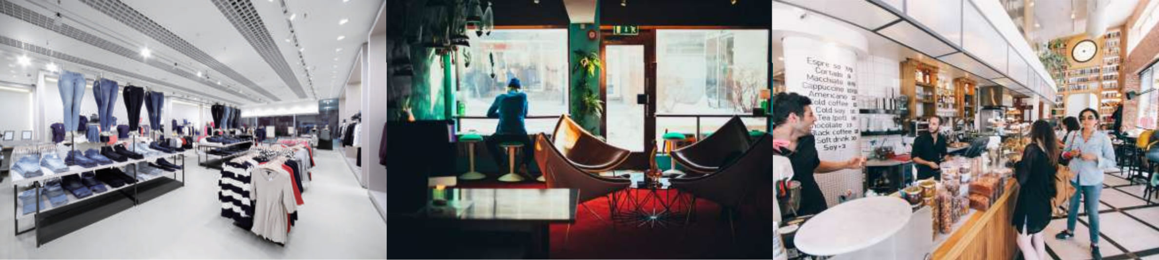 sports complexes, retail establishments, restaurants/bars, transportation hubs, healthcare facilities,